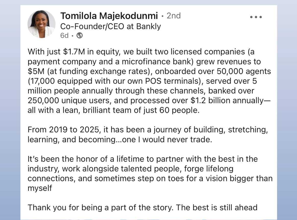 What does it take for your fintech to be acquired by an investment firm? Tomilola, whose fintech Bankly was acquired by C-One Ventures, shared a blueprint.