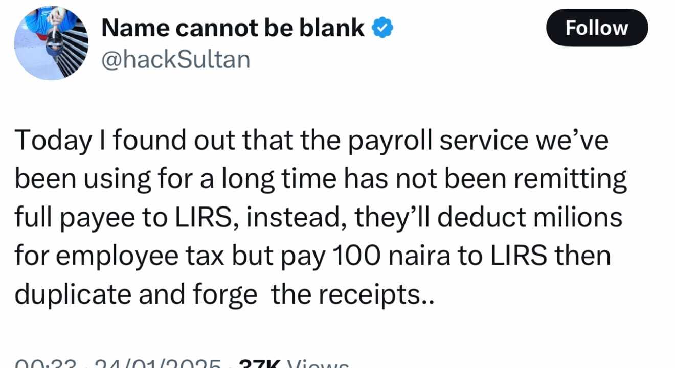 Today I found out that the payroll service we’ve been using for a long time has not been remitting full payee to LIRS, instead, they’ll deduct milions for employee tax but pay 100 naira to LIRS then duplicate and forge the receipts..— Name cannot be blank (@hackSultan) January 23, 2025