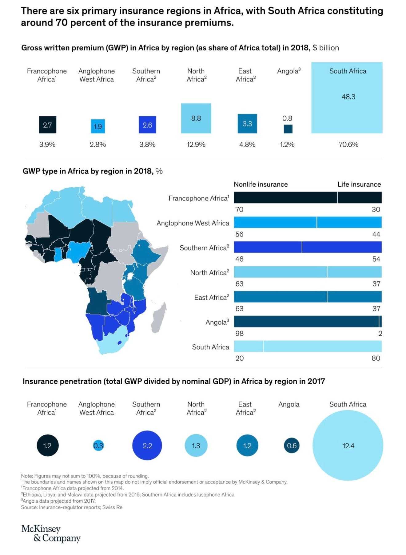 Africa's insurance market is $68 billion in Gross Written Premiums. Over 70% of this business is based in South Africa, with an insurance penetration of 17%.