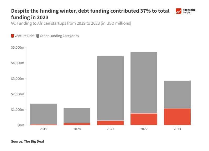 Despite the funding winter, debt funding contributed 37% to total funding in 2023