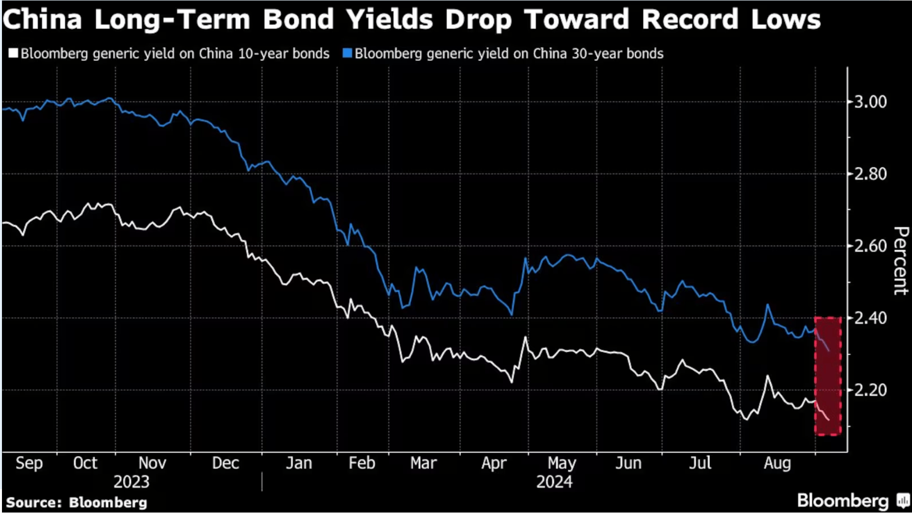 Chinese bond investors are driving yields to record lows, anticipating a gloomy economic outlook and disregarding the PBOC's attempts to cool the bond market rally. The PBOC has intervened by selling long-dated bonds, but strong demand from local investors and expectations of rate cuts have largely offset these efforts. Analysts believe the PBOC may prioritize economic support over yield curve control, leading to potential rate cuts. Despite the PBOC's actions, economic concerns continue to push bond yields lower.