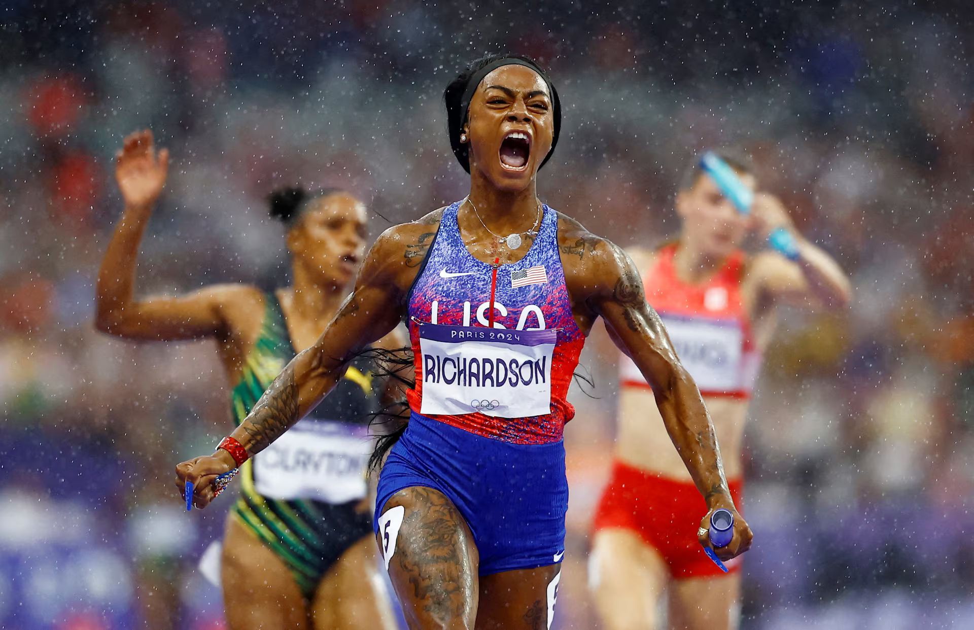 Sha'Carri Richardson celebrates after winning gold in the women's 4 x 100m relay final. (Sarah Meyssonnier)