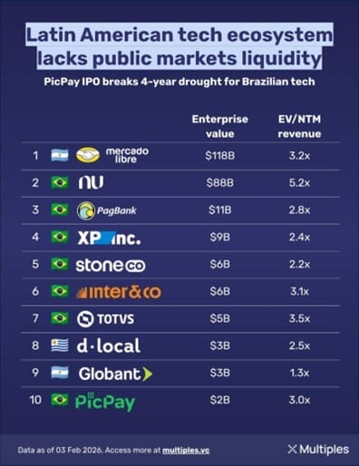 LatAm public tech sector remains highly concentrated and underdeveloped: the region’s listed tech companies have a combined enterprise value of ~$250B, with Mercado Libre ($118B) and Nu ($88B) representing 80%+ of the total; Brazil dominates the rankings (7 of the top 10 companies), while PicPay’s ~$2B IPO ended a 4-year drought in Brazilian tech listings since Nu’s 2021 IPO, highlighting a structural gap between abundant private unicorns (Rappi, Kavak, Clip, Creditas, Bitso, CloudWalk) and scarce exits, with large-scale M&A still rare in LatAm.