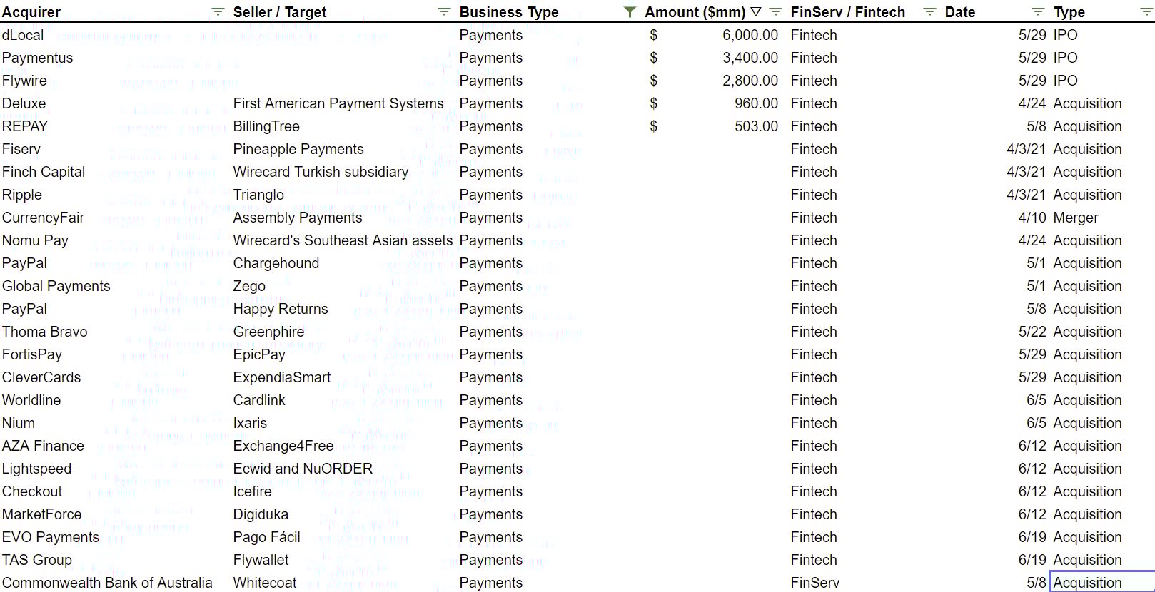 Payments was the dominant category in number of transactions, with 25 deals done (Lending deals came in second with 11 and Bank deals with 10 transactions).
