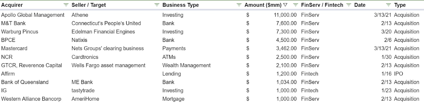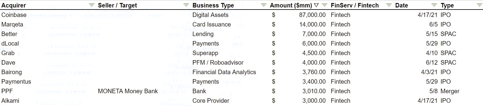 Interestingly, whereas financial services M&A and IPO activity dominated the largest disclosed deal sizes in Q1 2021 (below), Q2 represented the definitive arrival of large fintech exits. It’s incredible to see that the largest 11 deals were all fintech companies. (In Q1, only one top 10 deal came from a fintech company - Affirm’s IPO.)