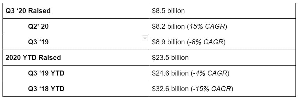 We tracked fintech fundraises by 186 companies across 37 different verticals in Q3. Here’s how the numbers stack up against prior periods: