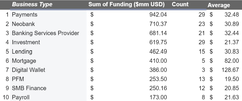 Of the 31 categories that raised, Payments startups ($942 million raised, 29 rounds) and Neobanks ($710, 23) once again commanded the highest share of funding. The third highest share last quarter went to a new consolidated category of Banking Services Providers ($681, 21) which I found particularly interesting (more below).