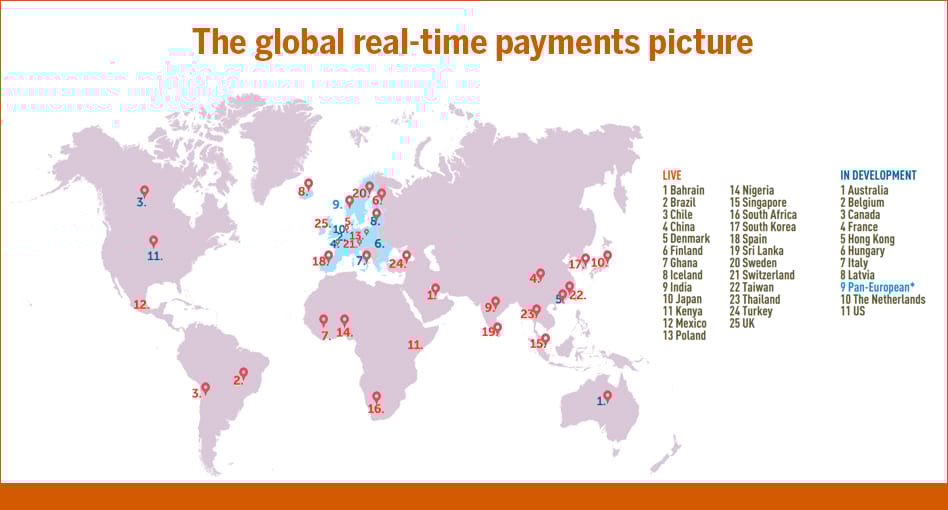 A map of live real-time payment infrastructures globally, now including Iceland and Brazil.