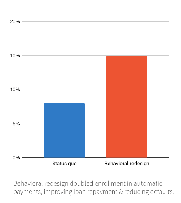 Our experiment with Beneficial State Bank increased customers' perception of control, doubling enrollment in automatic payments, improving loan repayment, and reducing defaults by 69%.