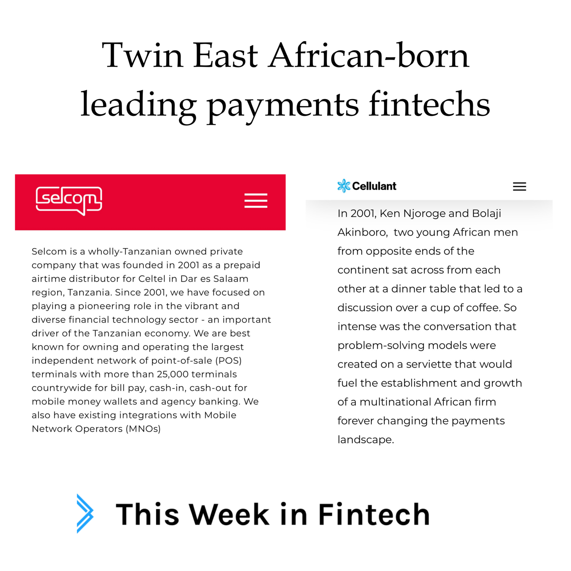 Selcom and Cellulant are prominent payments companies in East Africa. While Selcom was born in Tanzania and Cellulant in Kenya, there are a few similarities between the two that tell a story.