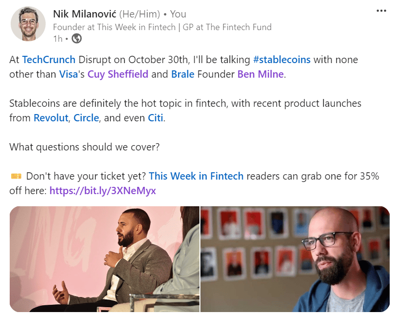 Who else is coming to TechCrunch Disrupt and wants to talk stablecoins? I'll be there with Visa's Cuy Sheffield and Brale founder Ben Milne talking about the exploding ecosystem around stables, exotic use cases, and where it goes from here. What should we cover?