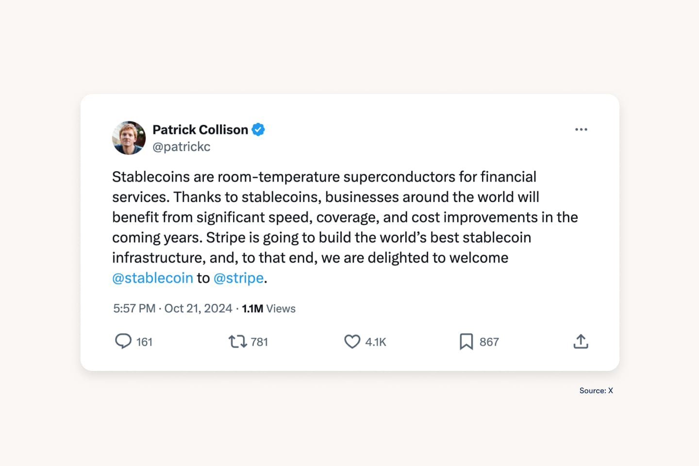 Stablecoins are an infrastructure upgrade for payments. Or as Stripe’s Patrick Collison put it, “superconductors for financial services”. They make it really easy to transfer money globally, in an instant, at a fraction of the cost. They operate across blockchains accessible 24/7/365.