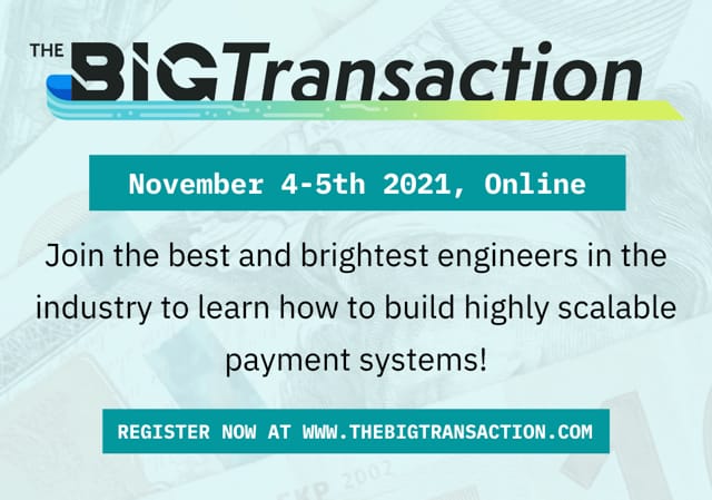The Big Transaction is a two-day, single track technical conference dedicated entirely to the art of payments engineering - join us virtually in November and learn the best strategies, architectures, tips, and tricks for building robust payment systems that work at scale! Featuring speakers from Stripe, Netflix, Shopify, Spreedly, and more! Tickets are only $29.99 and on sale now - get yours today!