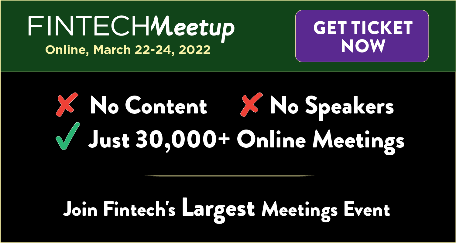Fintech Meetup is the industry’s next can’t-miss event! It’s the easiest and most efficient way to find new solutions, partners and customers. No Content. No Speakers. Just 30,000+ online speed date meetings so you can meet fintechs, investors, banks, neobanks, credit unions, networks, tech cos and more! Online, March 22-24, startup rate available for qualifying cos. Get Ticket
