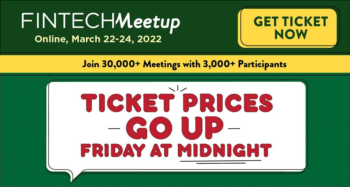 Fintech Meetup is the industry’s next can’t-miss event! We cut out the stuff you don’t need (content and speakers) so we can focus on what you do need--meeting new partners and customers. We’re facilitating 30,000+ online speed date meetings so you can easily meet fintechs, investors, banks, neobanks, credit unions, networks, tech cos and more! Online, March 22-24, startup rate available for qualifying cos. Ticket Prices go up on Friday--Get Ticket Now