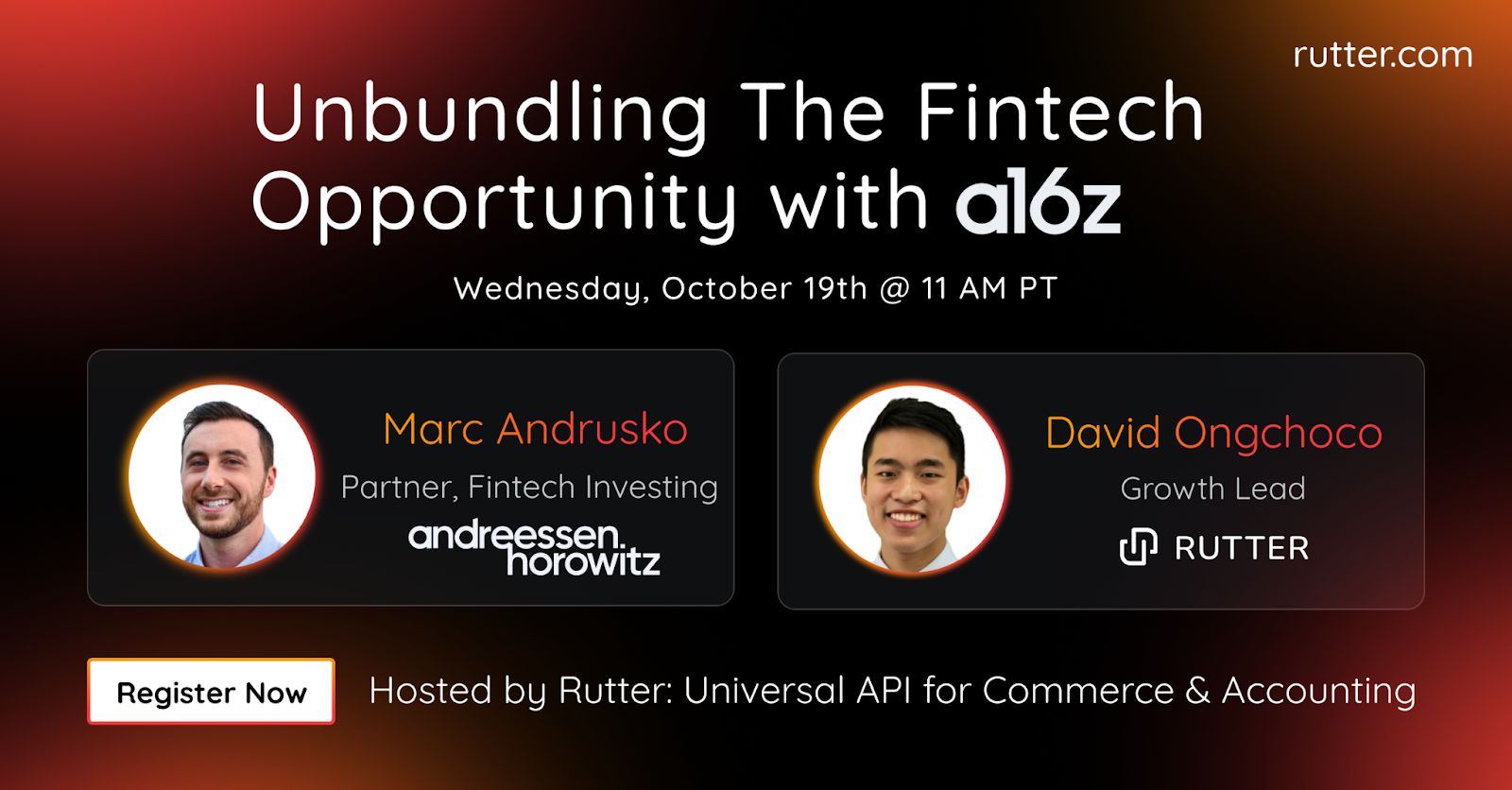 Join us for a panel discussion, Unbundling The Fintech Opportunity with Marc Andrusko from a16z, on Wednesday, October 19, 2022, at 11 AM PT. Learn More