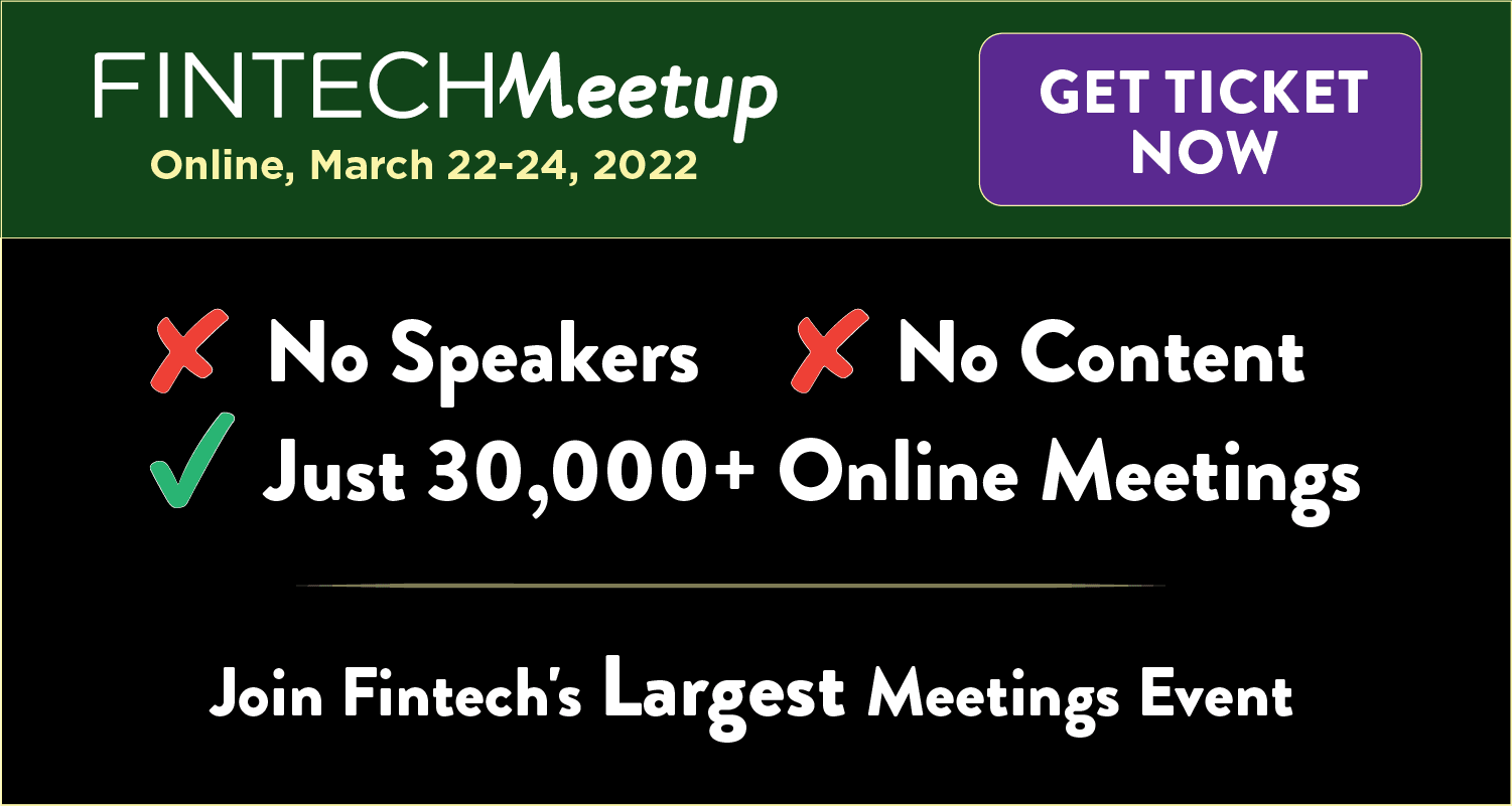 Whatever you need, you’ll find it at Fintech Meetup! Leads Partnerships Funding Investment Opportunities . It’s the world’s largest fintech meetings event--no speakers, no content…just 30,000+ double opt-in online meetings with everyone you want to meet. Meet 3,000+ participants from Fintechs, Banks, Credit Unions, Community Banks, Investors, Networks, Solution Providers, Tech cos, Retailers & Merchants and many others! Online, March 22-24. Get Your Ticket