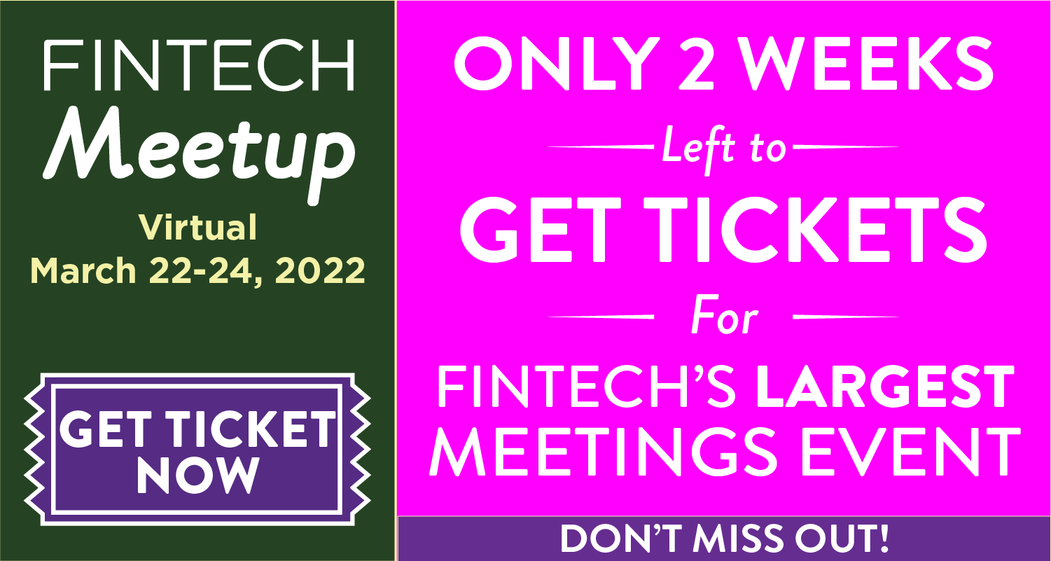 Don’t miss out on 30,000+ meetings at Fintech Meetup! There’s less than 3 weeks left to get your ticket to the world’s largest fintech meetings event. Join for the easiest way to meet and create opportunities with thousands of Fintechs, Investors, Banks, Credit Unions, Networks, Payments Companies, Retailers & Merchants, Media and many others! Virtual, March 22-24. Get Ticket Now