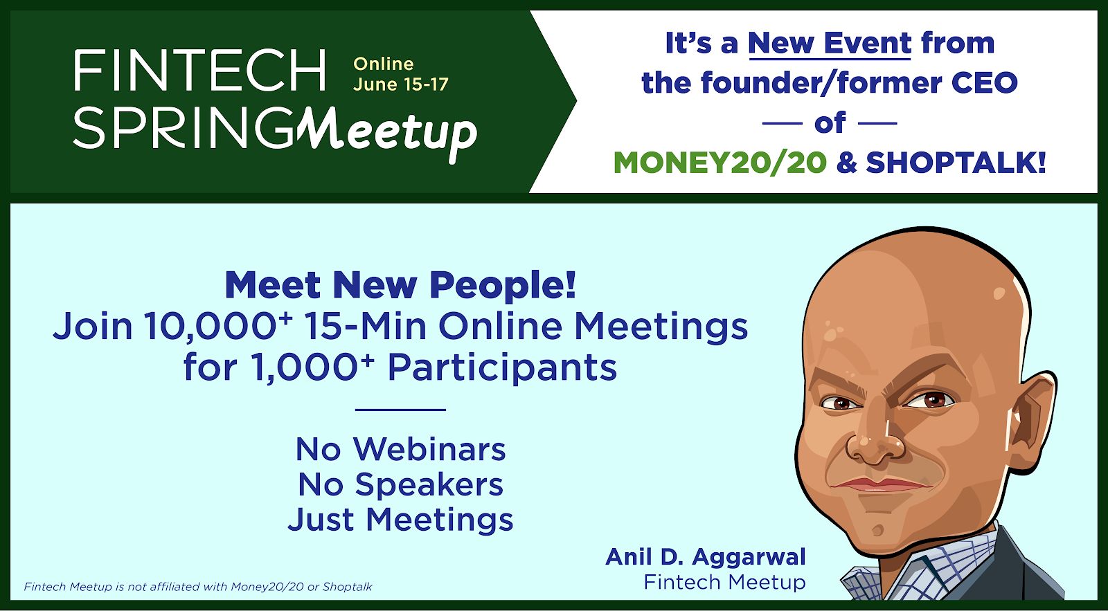Fintech Meetup is a new event from the founder/former CEO of Money20/20 and Shoptalk! We’re scheduling 10,000+ 15-minute online meetings so you can meet new people. No webinars. No speakers. Just meetings. Get your ticket now to join 1,000+ others, June 15-17.