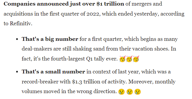 M&A is back! Even as the IPO market swoons, there were $1 trillion in M&A deals in Q1 this year (data from Axios below), with 11 fintech deals in the last week alone.