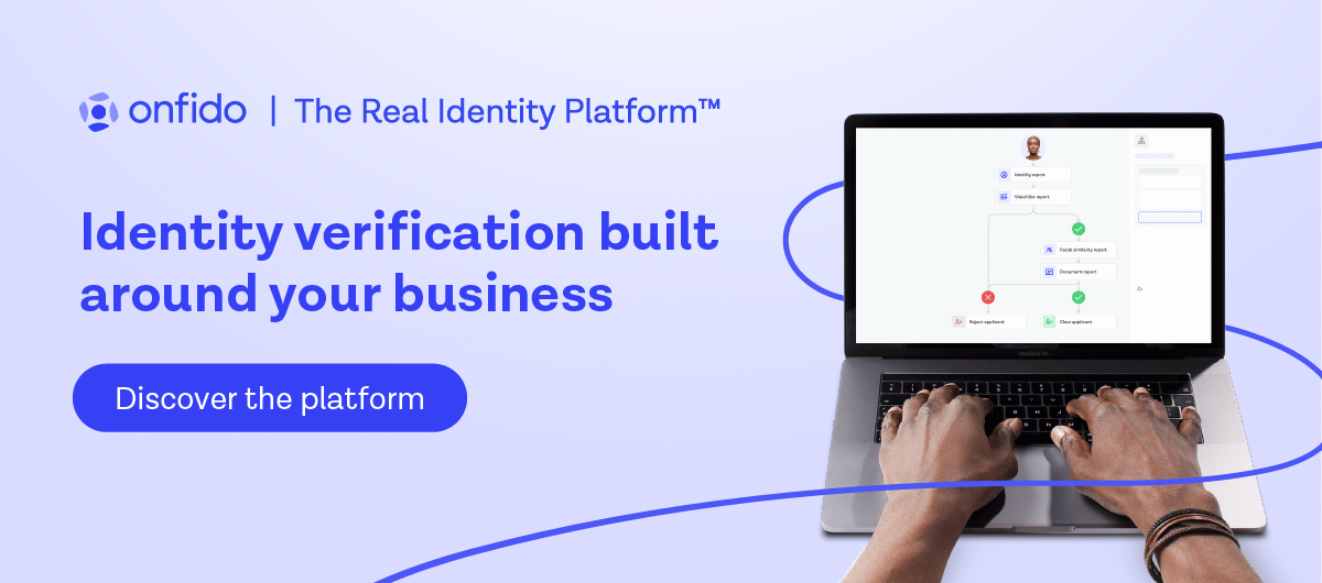 Identity verification plays a critical role in fraud detection, customer acquisition and regulatory compliance. The Onfido Real Identity Platform makes it simple. It’s an end-to-end identity verification solution featuring a comprehensive library of checks and signals and powerful no-code workflow builder – so you have everything you need to build identity verification around your business. Learn more
