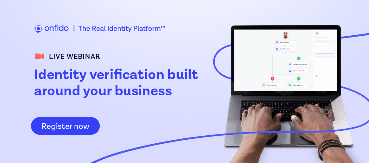 Changing regulation, evolving fraud and rising customer expectations have made identity verification complicated. Onfido is making it simple. Our Real Identity Platform makes it easy to orchestrate tailored workflows using a suite of checks and signals – so it’s easy to stay compliant, detect fraud and deliver great customer journeys. Join our webinar to see it in action.
