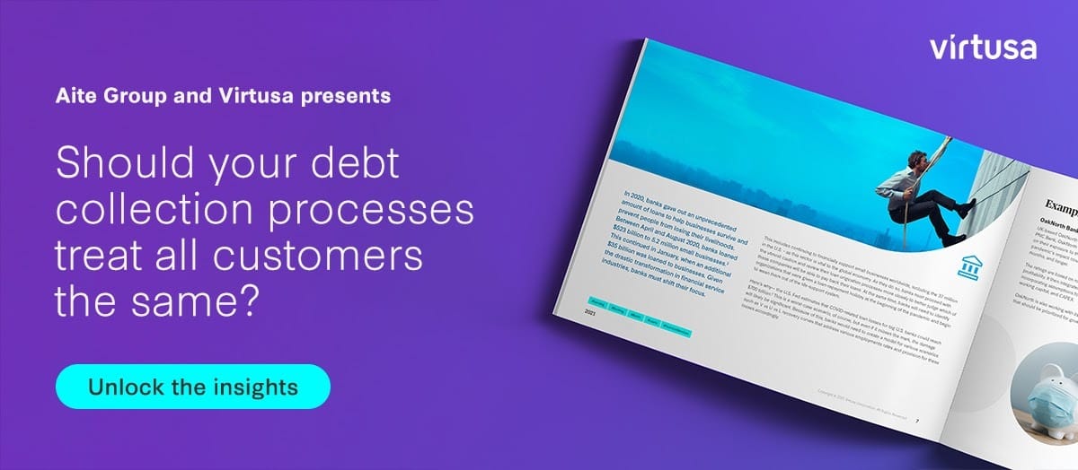 “52% of financial services institutions are concerned about collecting on delinquent loans,” Aite Group. Your debt collection process is essential to maintain existing relationships. Considering each borrower’s financial circumstances will prevent delinquency, reduce your outstanding collections, and ultimately show customers that you care. Download the report by Aite Group and Virtusa.