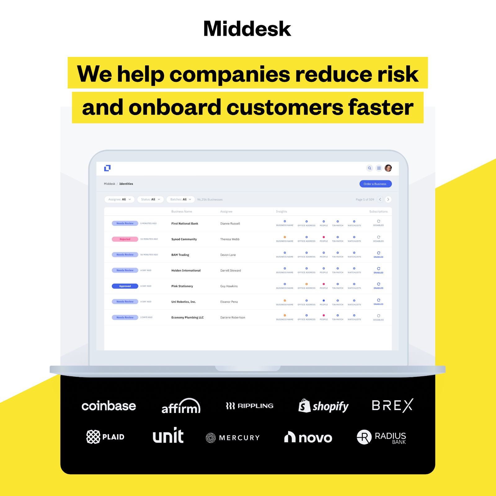 Middesk is the leading business identity platform. With Middesk’s identity-as-a-service APIs, businesses can verify, underwrite, and enable their customers to grow their businesses. Middesk’s current customers include Plaid, Affirm, Bluevine, and Novo, as well as several large banks and lenders.