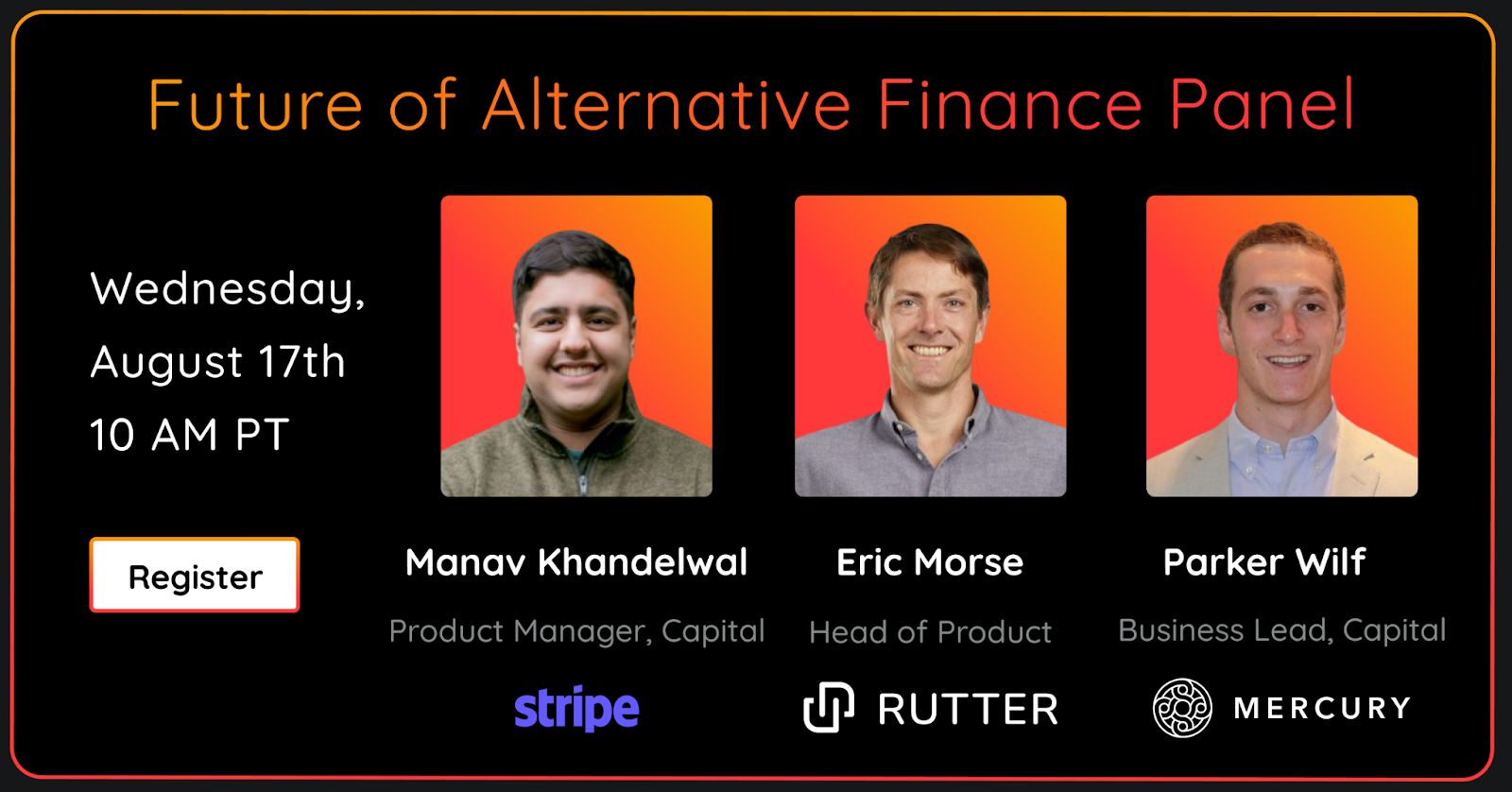 Join us for a panel discussion around the future of alternative finance with Stripe and Mercury on Wednesday, August 17, 2022, at 10 am PT. Learn more here.