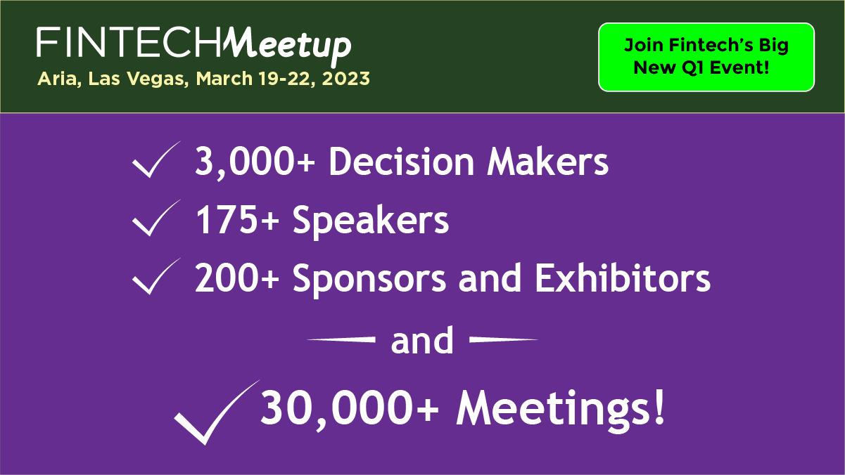Fintech Meetup (March 19-22, 2023 – Aria, Las Vegas) is the only industry event that delivers measurable ROI. We have it all - amazing speakers, exhibit hall, receptions, and more… plus we’ll facilitate 30,000+ onsite meetings with proprietary tech.