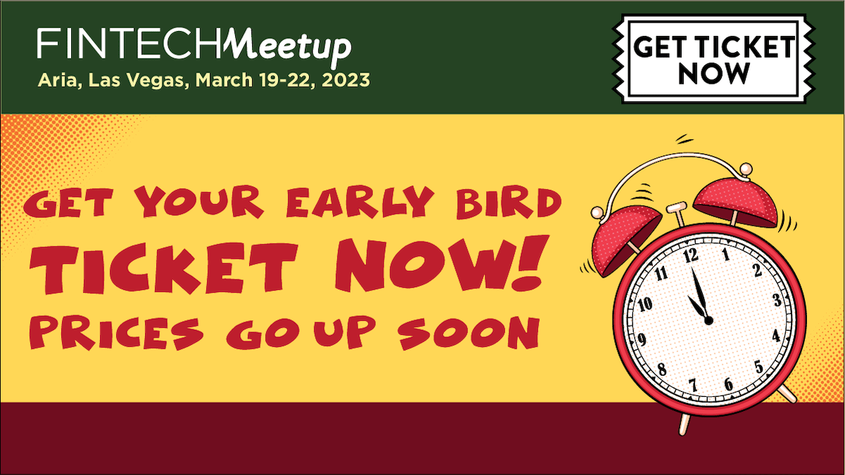 Fintech Meetup Registration is now open! Get tickets at the lowest rate we’ll offer! We’ve got the world’s best meetings tech platform – we’ll facilitate 30,000+ in-person meetings at our event (March 19-22 at the Aria, Las Vegas). Our tech works and the proof is in the pudding: The past 2 Fintech Meetups (both were virtual events) facilitated over 50,000+ meetings. First 100+ speakers just announced - See the list here. Get your individual or bulk tickets now before prices go up. Click here to register.