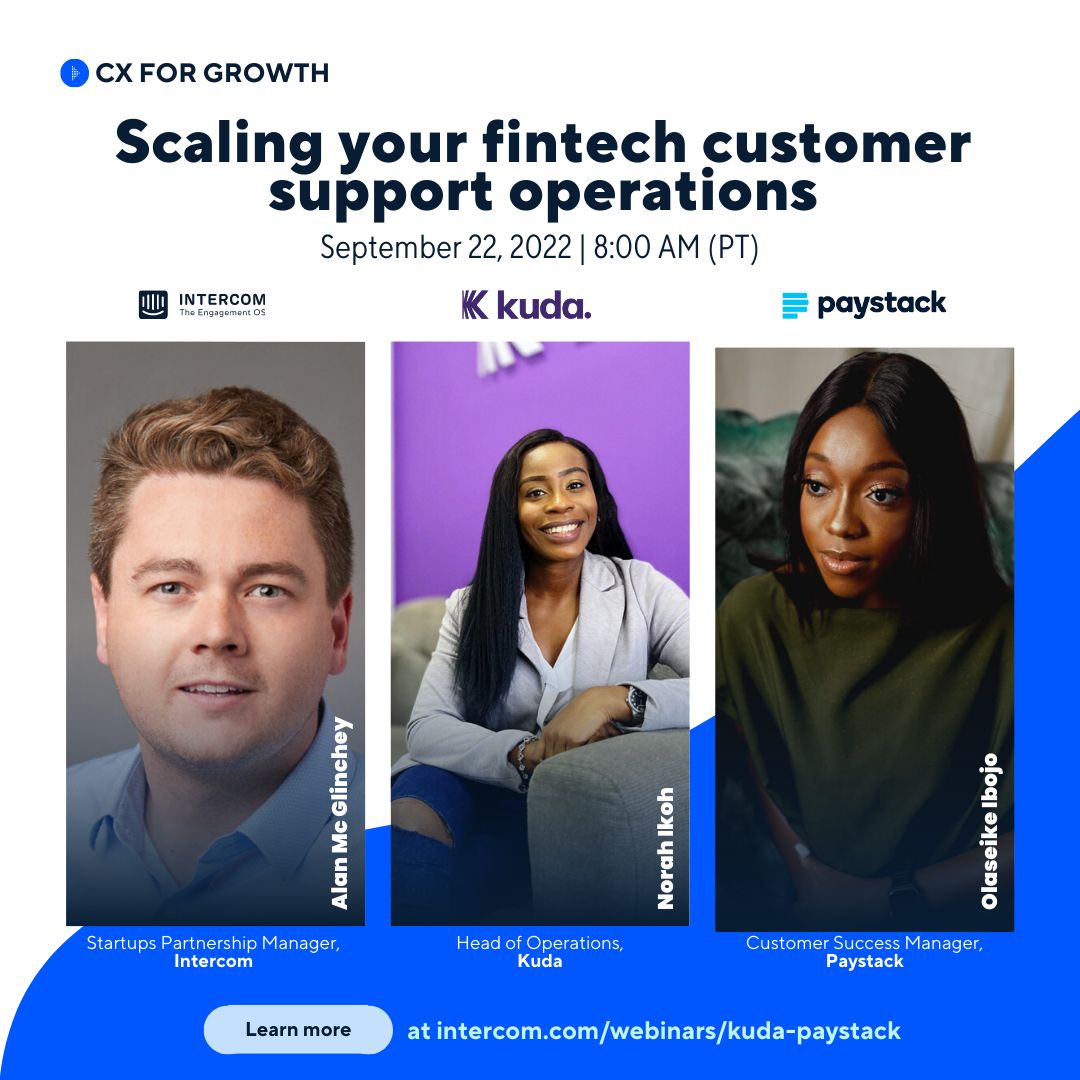 Intercom's hosting an upcoming webinar on Scaling your fintech customer support operations featuring Norah Ikoh, Head of CX Operations at Kuda and Olaseike Ibojo, Customer Success Manager, Disputes at Paystack, moderated by Alan Mc Glinchey, Startups at Intercom to share best practice on scaling customer support operations.