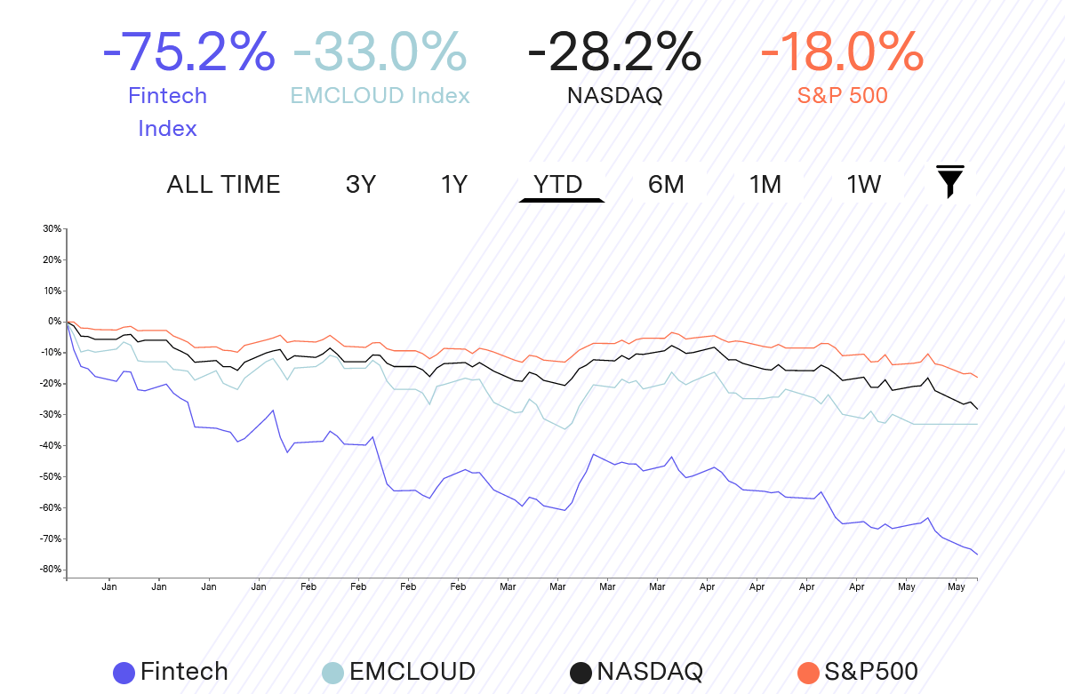 The Global Fintech Index maintained by FPrime Capital is down 75.2% YTD. The index is composed of 60 global, public fintech companies.