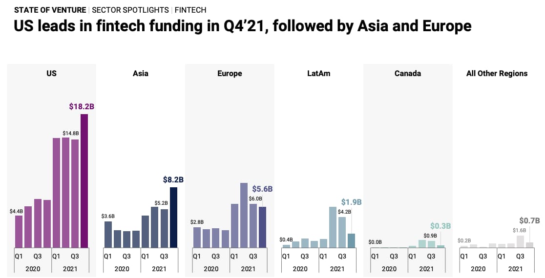 In 4Q21, an average of 14 fintech deals were announced every day. That would be $387,777,777 raised every 24 hours. Global fintech funding in 2021 reached a new record of $131.5 billion across 4,969 deals. 🤯 (Source)