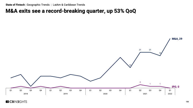 Latam saw a record-breaking quarter for mergers and acquisitions (M&A), with 29 transactions in Q1 2022. (Source)