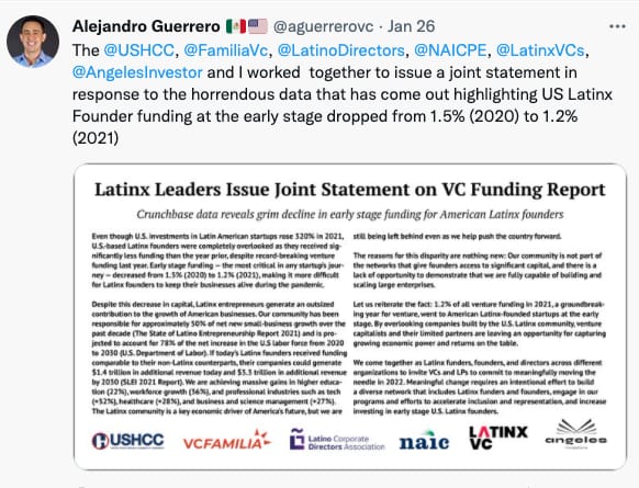 Funding to Latinx founders in the US has increased in dollar terms but decreased to 1.2% of overall VC investment