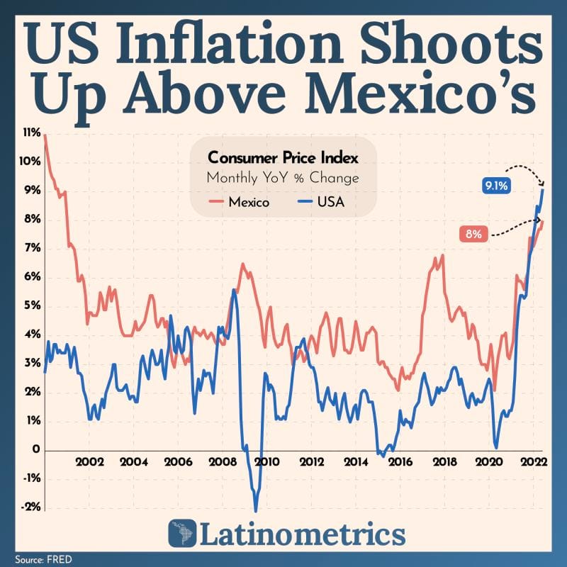 At 9.1%, the Consumer Price Index in the US is currently higher than Mexico’s 8%: