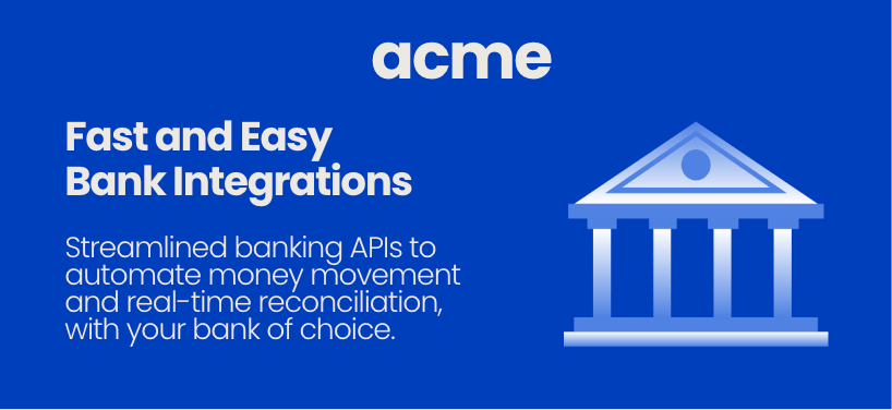Have you ever felt pain from manual finance processes or high card payment costs? Or maybe you're looking for levers to optimize revenue. Meet Acme Technology. Our software enables you to connect directly with your bank of choice to automate all your finance and payments processes. Think real-time reconciliation and direct-to-bank payments. No lengthy integration, just streamlined APIs that transform your bank integration into a Stripe-like experience.