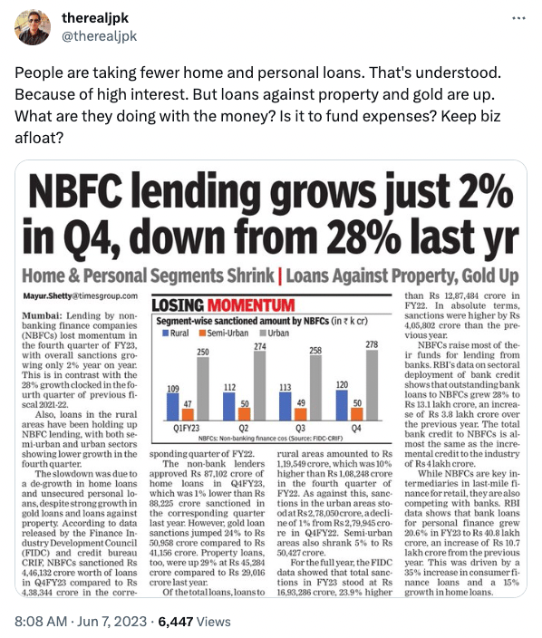 NBFC industry lending grew 2% YoY in Q4 FY23 (ended 31st Mar, 2023) to INR 4,46,132cr ($ 54bn) but full year lending grew 24% YoY to INR 16,93,286cr ($ 205bn).
