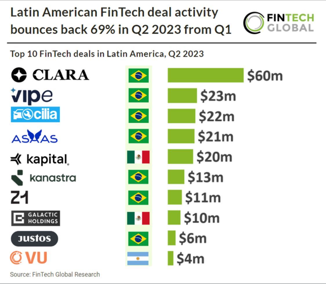 In Q2 of 2023, the fintech sector in Latam had a 69% increase in deals compared to Q1, with a total of 76 deals and $254 million invested. (Source)