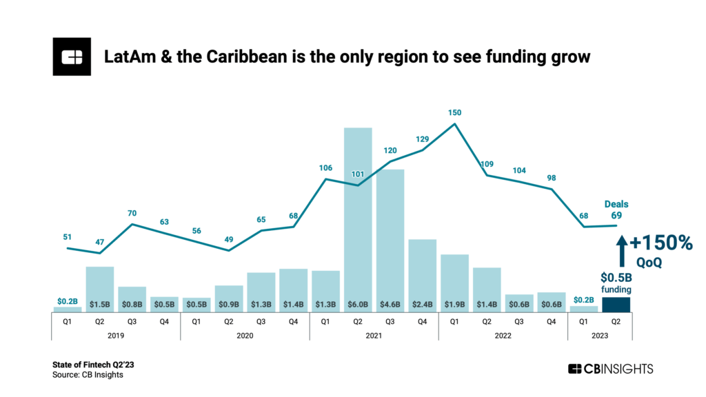 Global fintech funding dropped by nearly half to US$7.8 billion, the lowest since 2017, per CBInsights' State of Fintech Q2'23 Report. In contrast, Latam fintechs raised US$500 million in Q1'23, marking a 150% surge from the previous quarter, with around 69 agreements.