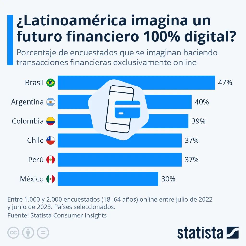 47% of Brazilians are ready for fully digital transactions, while Argentina (40%), Colombia (39%), Chile (37%), Peru (37%), and Mexico (30%) show lower digital financial adoption.(Source)