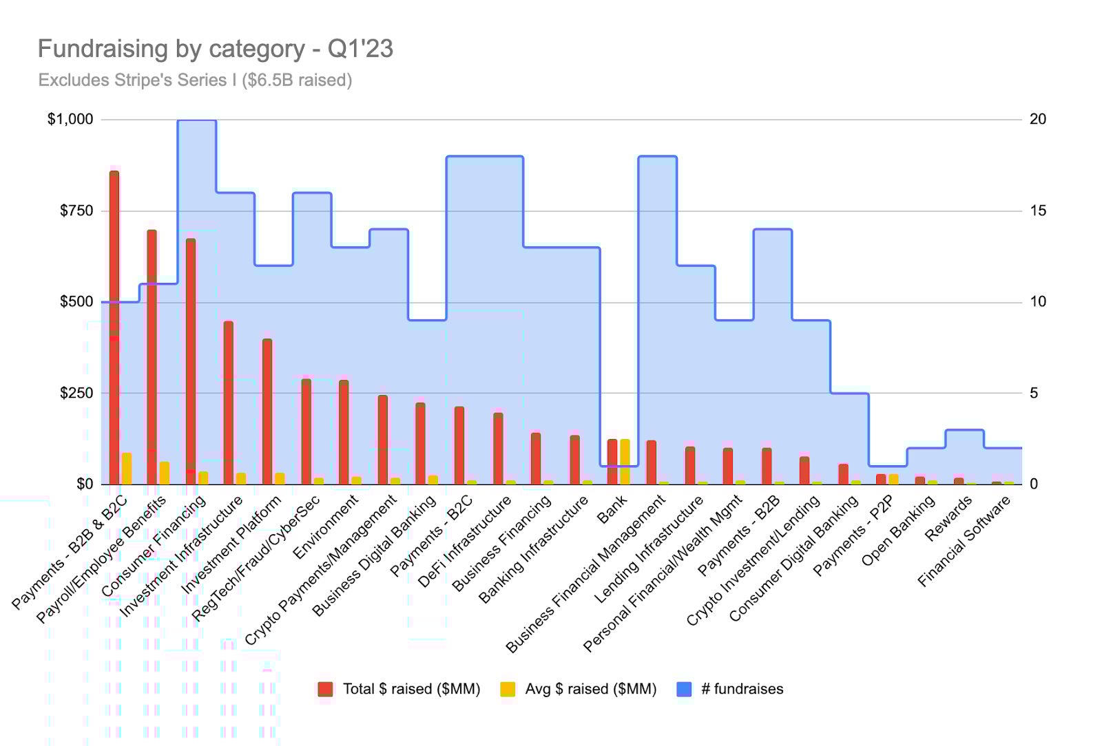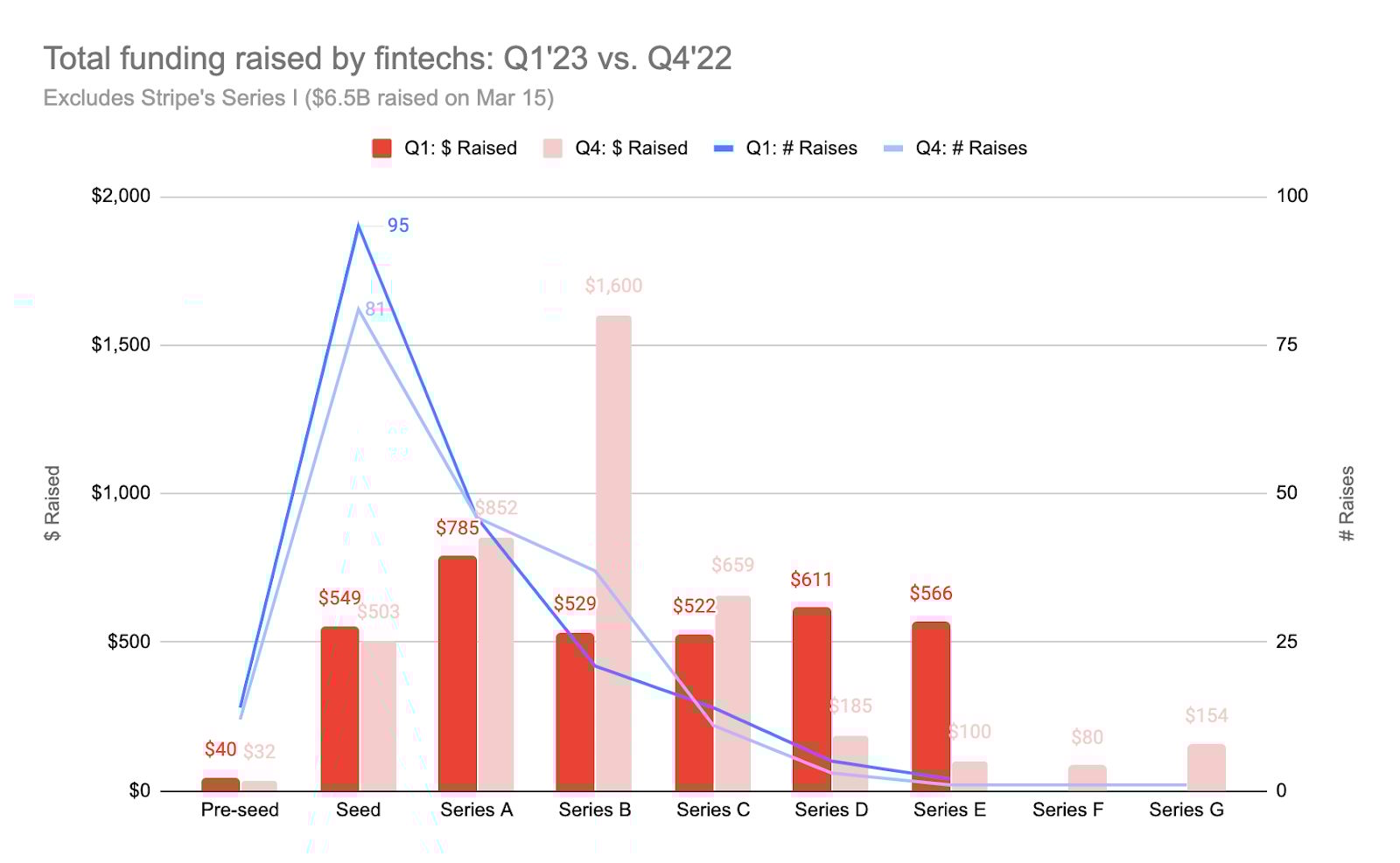 Fintechs raised a total of $12.1 billion in Q1, over half of which was comprised of Stripe’s nail-biting, employee-RSU-triggering Series I. Excluding Stripe from the dataset, fintech funding decreased by $114 million, or 2%, from the prior quarter.