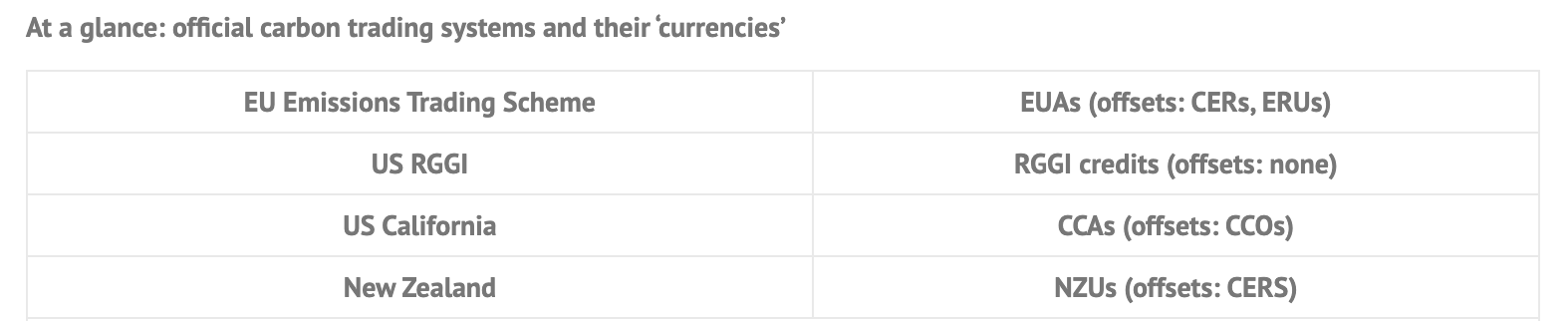 Regulated carbon markets exist in 34 jurisdictions today, including the EU, Canada, China, and eleven US states. In certain regulated markets, companies can substitute carbon offsets for government-issued carbon credits.